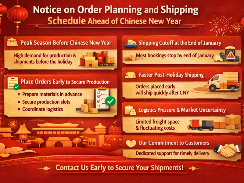 If you have upcoming projects or shipment plans, please contact our sales team as early as possible. We will work closely with you to arrange production schedules and help ensure timely delivery before or shortly after the Chinese New Year holiday.