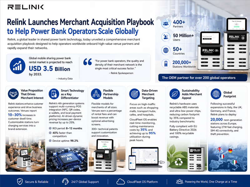 Relink, a global leader in shared power bank technology, today unveiled a comprehensive merchant acquisition playbook designed to help operators worldwide onboard high-value venue partners and rapidly expand their networks.